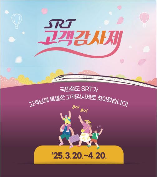 SRT 운영사 에스알(SR)은 고객 성원에 보답하고자 2025년 3월 20일(목)부터 4월 20일(일)까지 한 달간 'SRT 고객감사제'를 실시합니다. 이 기간 동안 최대 40%의 열차 운임 할인과 함께 숙박, 교통, 테마파크 등 다양한 제휴 혜택을 제공하오니 많은 이용 바랍니다.