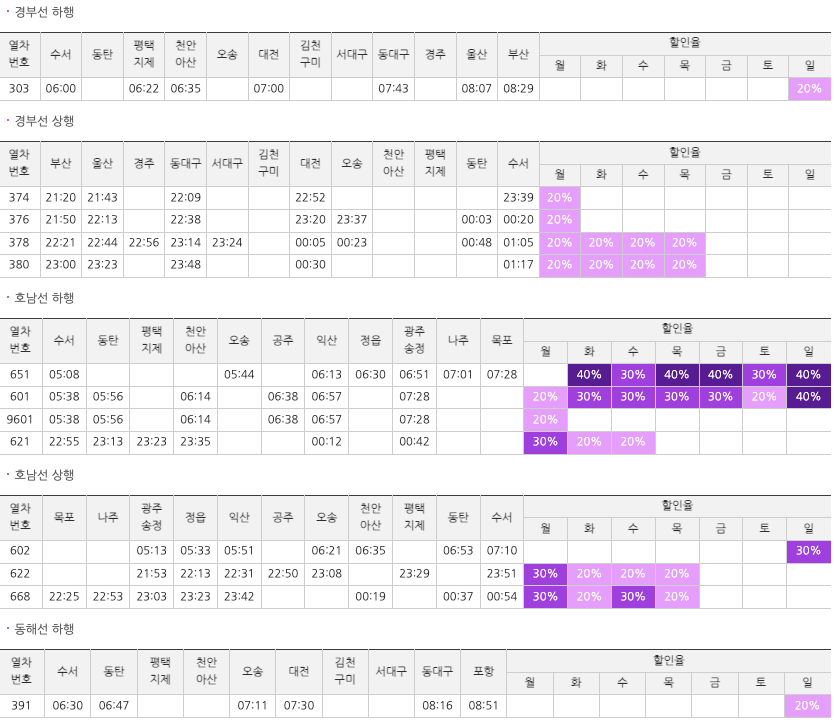 - 부산(23:00) → 수서(01:17) / 할인율: 20%