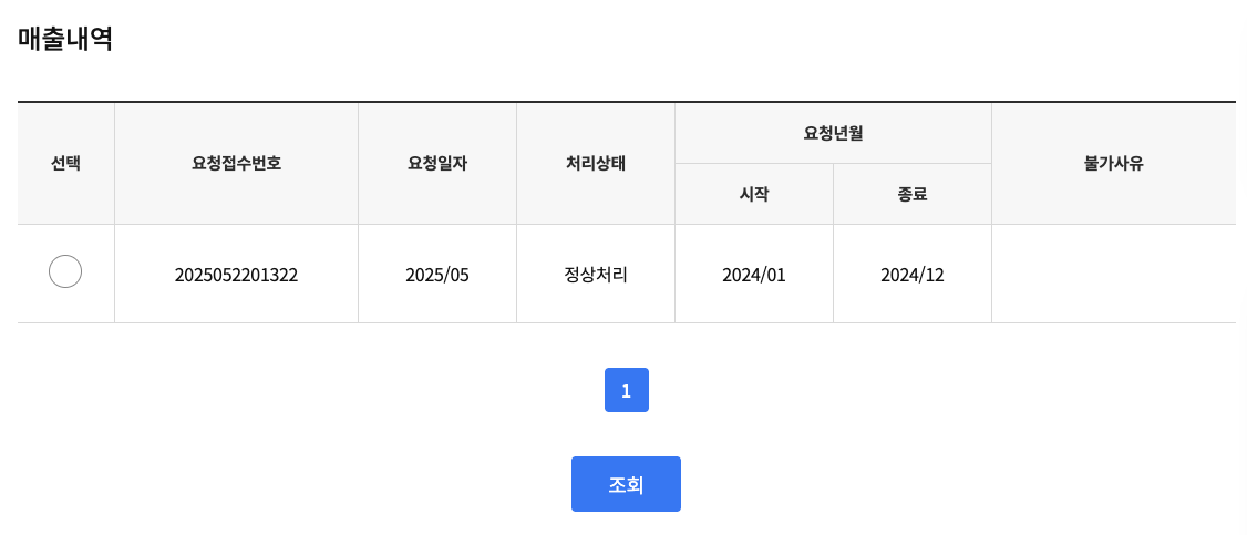 4. 매출내역 선택 후 아래 [조회] 버튼 클릭