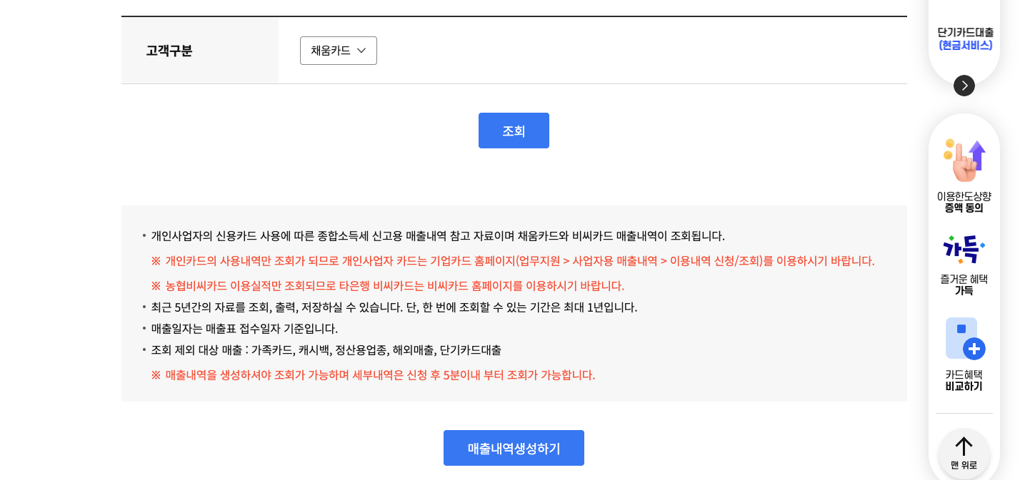 3. 조회 카드 선택 후 [조회] 버튼 클릭 후 [매출내역생성하기] 버튼 클릭