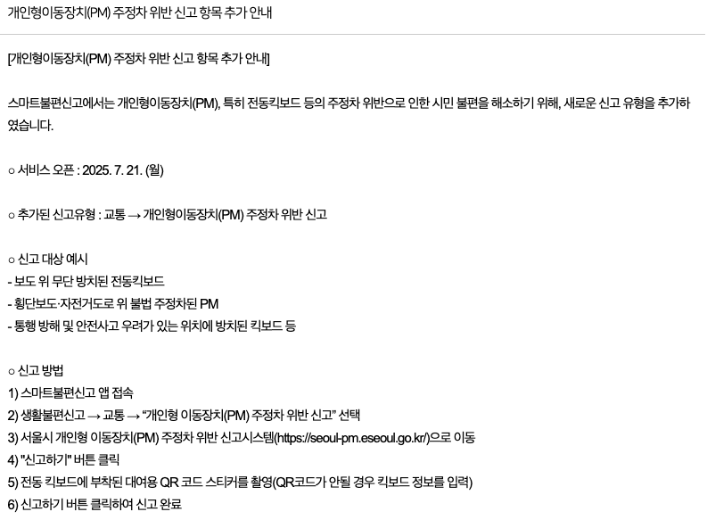 - 접속 경로: 생활불편신고 → 교통 → 개인형 이동장치(PM) 주정차 위반 신고