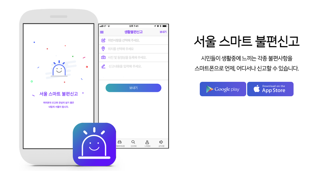 - 앱/웹: 구글 플레이스토어 , 애플 앱스토어, 웹에서 ‘서울스마트불편신고’ 검색