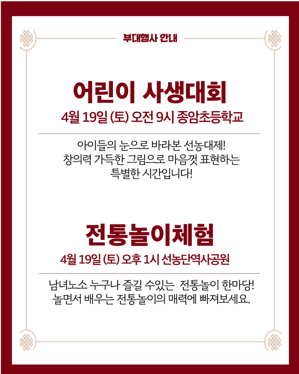 🌾 선농대제는 우리 전통문화를 체험하고 지역 공동체와 함께하는 소중한 시간입니다. 가족, 친구들과 함께 방문하셔서 풍성한 행사와 따뜻한 나눔을 경험해보세요!