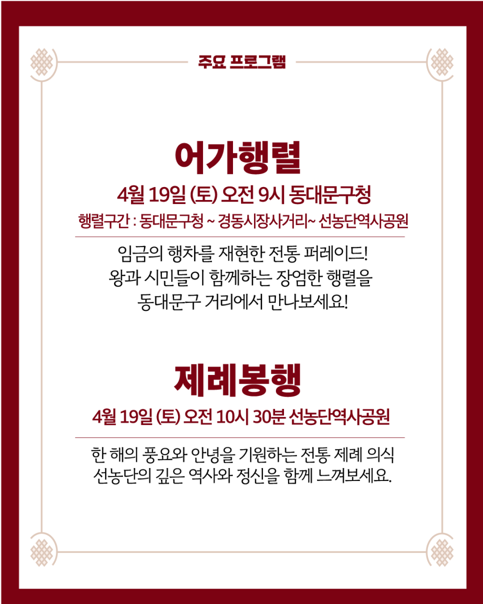 🌸 따뜻한 봄날, 서울에서 가장 전통 있는 문화축제 '선농대제'에 함께 하세요! 모두의 건강과 풍년을 기원하는 조선시대의 정신을, 오늘에 이어갑니다.