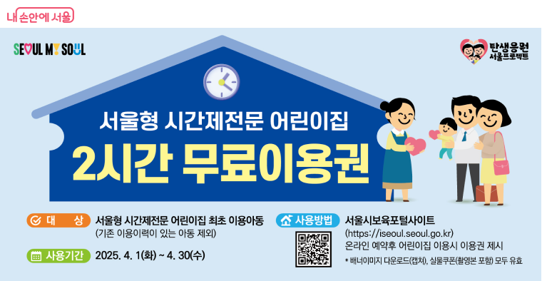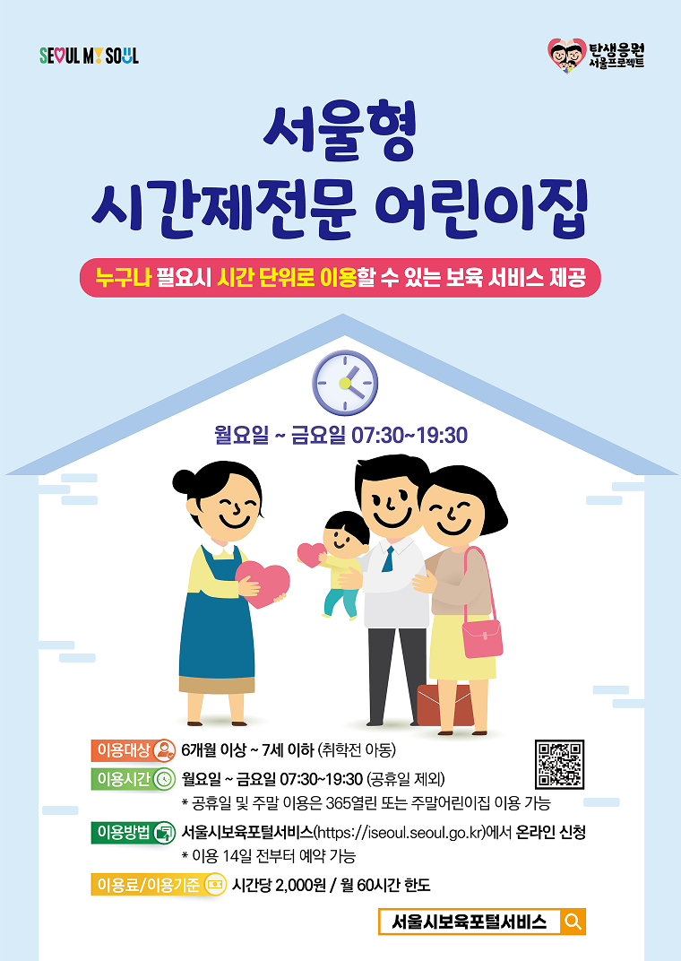 육아로 인해 개인적인 시간을 갖기 어려운 부모님들을 위해, 서울시는 '서울형 시간제전문 어린이집'을 운영하고 있습니다. 이 서비스는 1시간 단위로 아이를 맡길 수 있어 큰 호응을 얻고 있습니다.