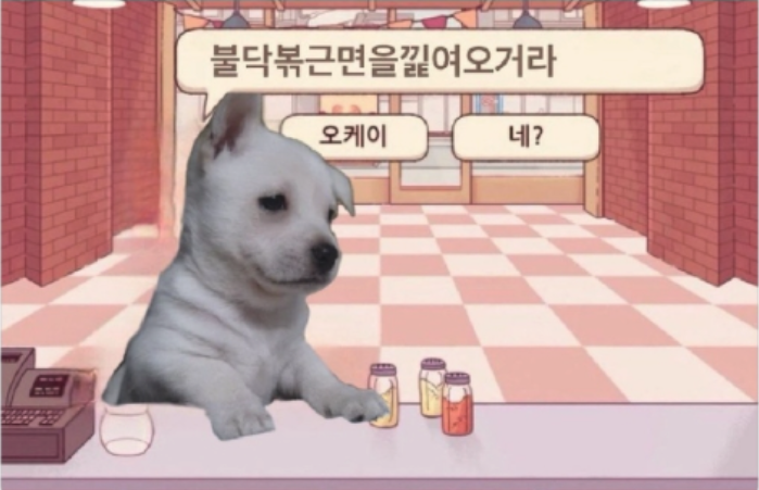 📢 불닥볶근면을 낉여오거라가 적힌 강아지 짤에서 파생된 밈