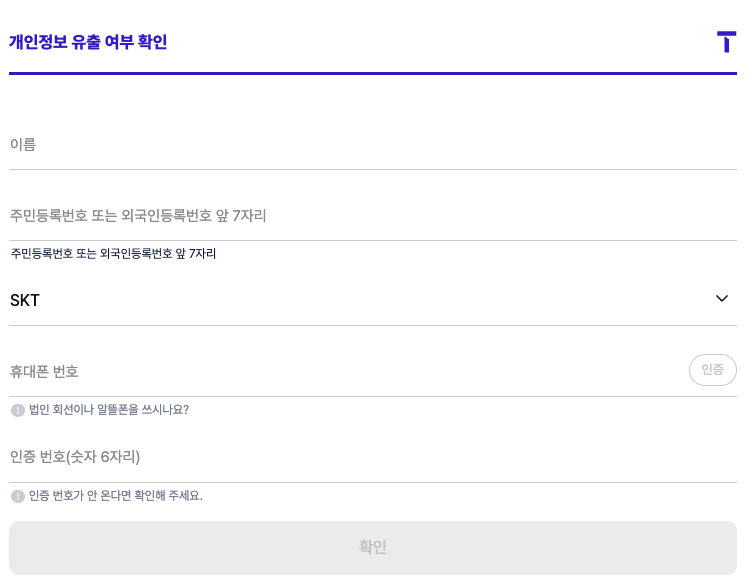 - 접속 경로: T월드 메인 → 개인정보 유출 여부 확인 배너 클릭