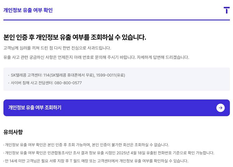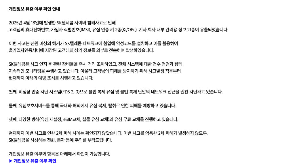 - 확인 대상: 2025년 4월 18일 당시 유출된 가입자 기준